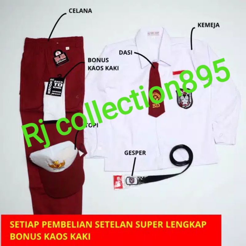 Setelan Super Lengkap Baju Seragam Sekolah SD Anak Laki Laki Tangan Lengan Pendek Celana Panjang Warna Merah Putih